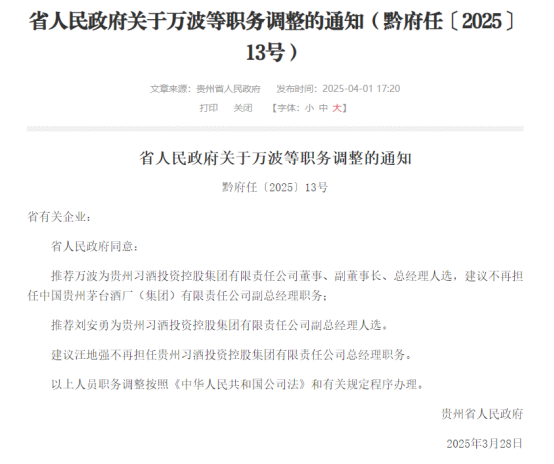 1日,贵州省人民政府发布《省人民政府关于万波等职务调整的通知》,推荐万波为贵州习酒投资控股集团有限责任公司董事、副董事长、总经理人选,建议不再担任中国贵州茅台酒厂(集团)有限责任公司副总经理职务;
