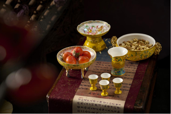 礼盒主体采用上乘骨质瓷,局部融入六百年历史的景泰蓝工艺,经制胎、掐丝、点蓝、烧蓝等数十道工序锤炼而成,明艳色泽与新春“红火兴旺”的氛围相得益彰。手柄处源自西汉鎏金铜当卢的龙马纹样,寓意“路路通达、一马当先”,精准契合丙午马年的吉祥寓意。更具巧思的是,套组单品可独立使用,拼合后又形成完整立体造型,实现实用性与艺术感的统一。