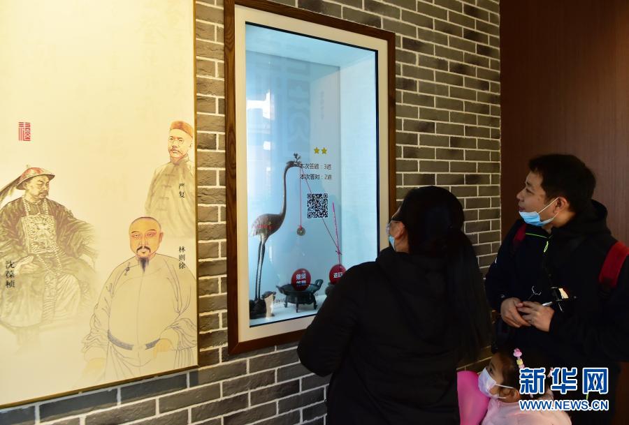2021年1月1日,小观众在电子大屏幕前查看福州市非物质文化遗产。 新华社记者 魏培全 摄