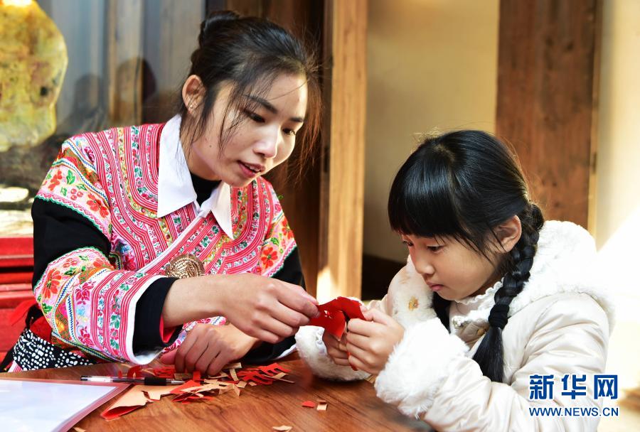 2021年1月1日,小观众在福州市非物质文化遗产展示馆的罗源畲族互动区体验剪纸艺术。 新华社记者 魏培全 摄