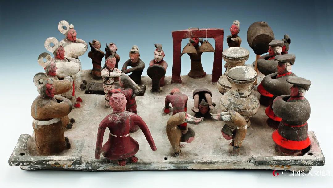1969年4月济南无影山西汉墓出土,长方形陶盘上塑造了21个造型各异的人物形象。左前方一身穿红袍者,好似领唱或者指挥。中间表演者六位,两女子身着花衣,一红一白,载歌载舞;四男子戴尖顶小帽,着紧身衣,作柔术表演。后侧为伴奏乐队,一列七位,左起依次为吹笙、鼓瑟、击小鼓、敲钟、击磬、击建鼓。左右两侧观赏者七位,长衣广袖,拱手而立。凝目观看,其中右侧三人戴冕冠,身前置酒壶。我国的音乐、舞蹈、杂技艺术历史悠久,到汉代发展到新的水平,这在汉画像石、画像砖中多有表现,但成组的杂技、乐舞同台演出的立体陶塑仅此一件。