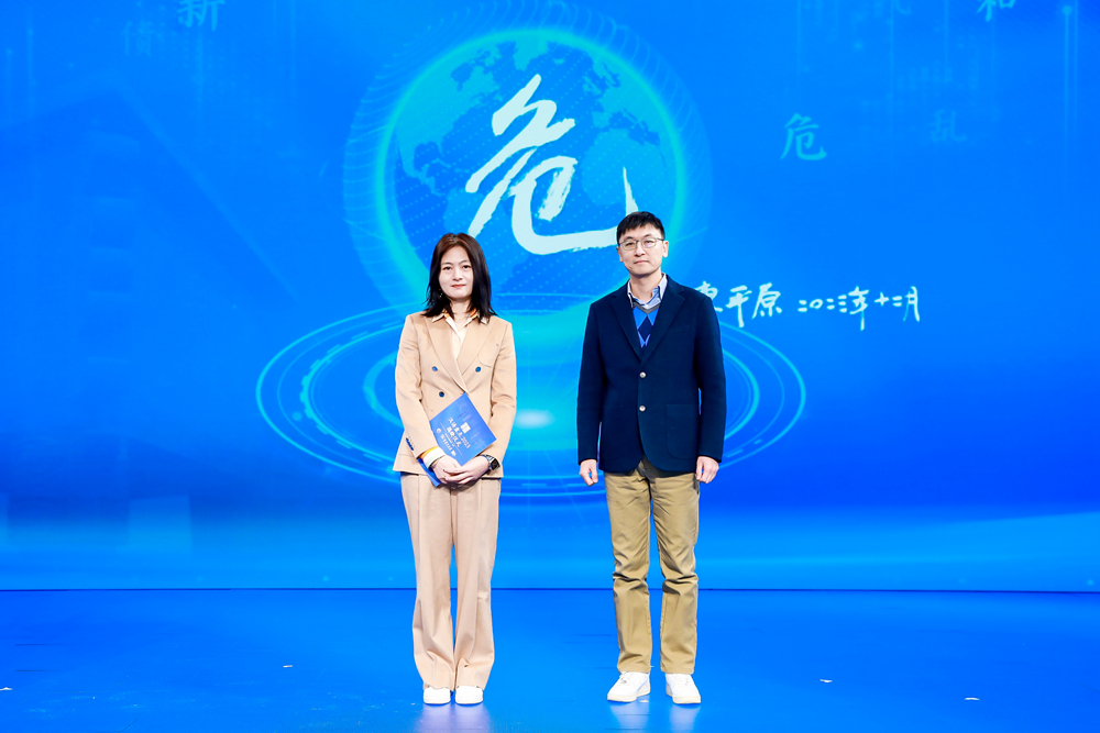快手科技副总裁徐静芸(左)、知乎领域与内容运营负责人王舒怀(右)揭晓年度国际字“危”。新华网 发