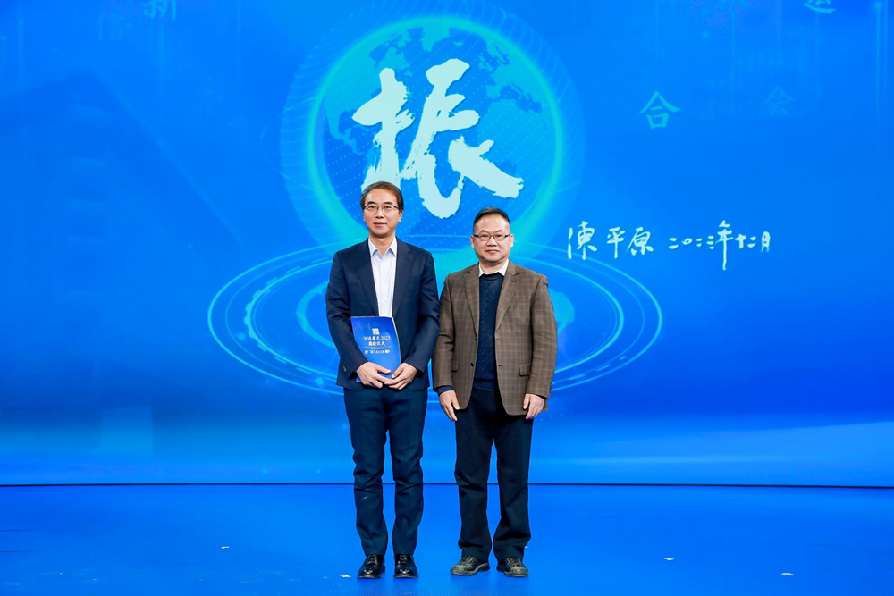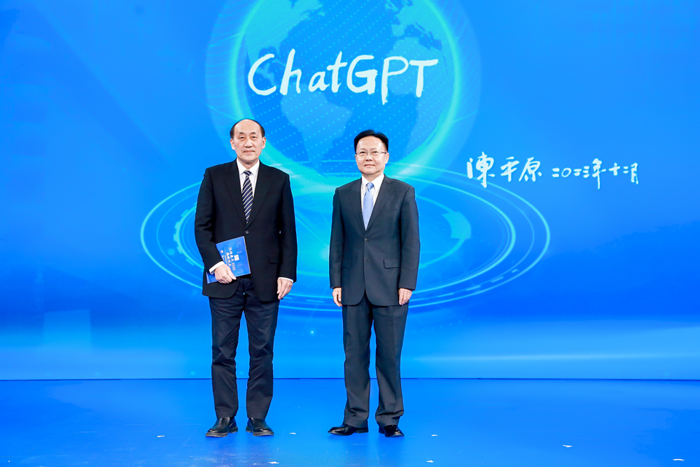 中宣部“学习强国”学习平台编委、副总经理杜大力(右),国家数字化学习工程技术研究中心副主任刘延申(左)揭晓年度国际词“ChatGPT”。新华网 发
