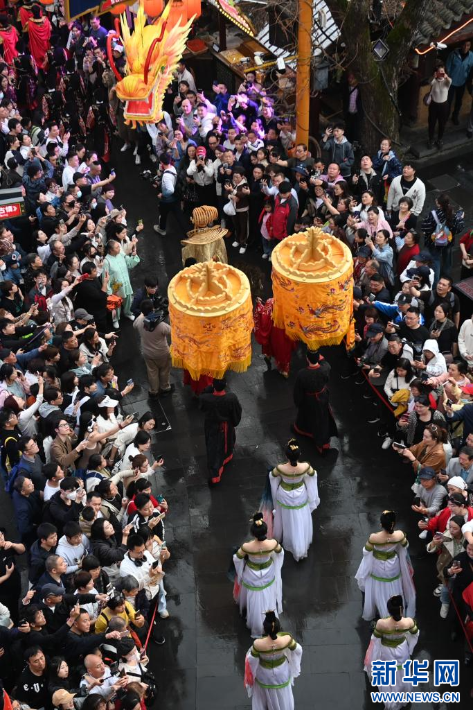 3月23日,游客在杭州宋城景区观看“大宋巡游”活动。