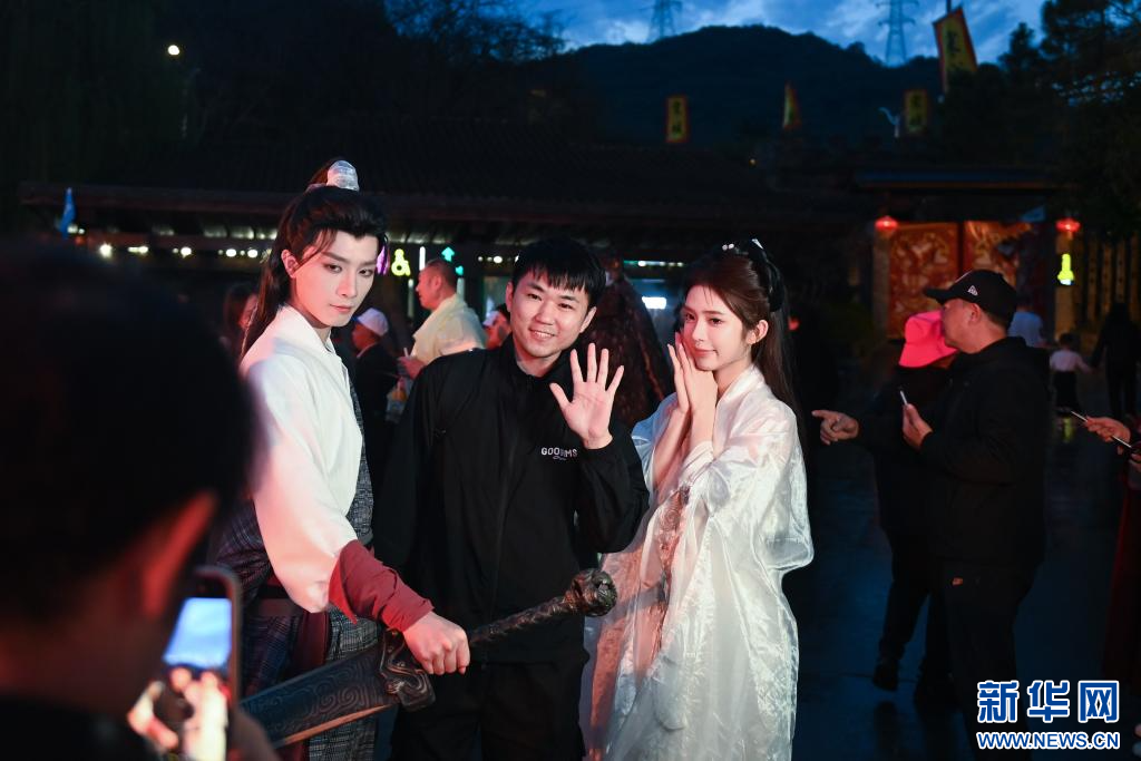 3月23日,游客在杭州宋城景区与快闪秀《大宋侠客行》的演员合影。