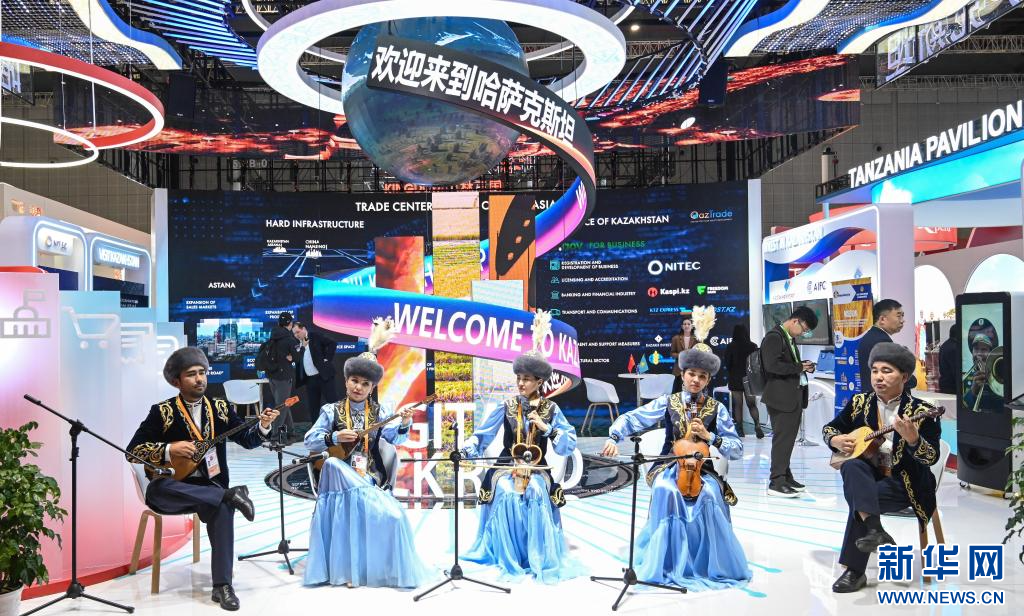11月6日,表演者在第七届进博会国家综合展的哈萨克斯坦展馆演奏乐曲。