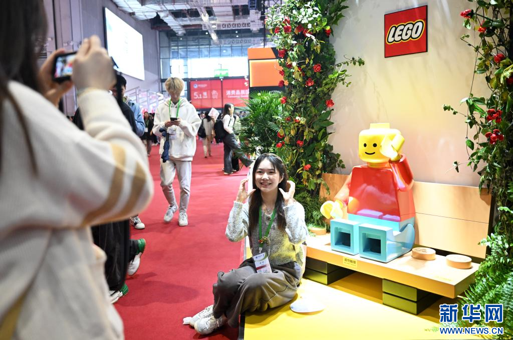 11月9日,观众在第七届进博会乐高展台外打卡拍照。乐高是进博会七届“全勤生”。