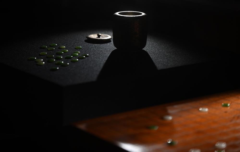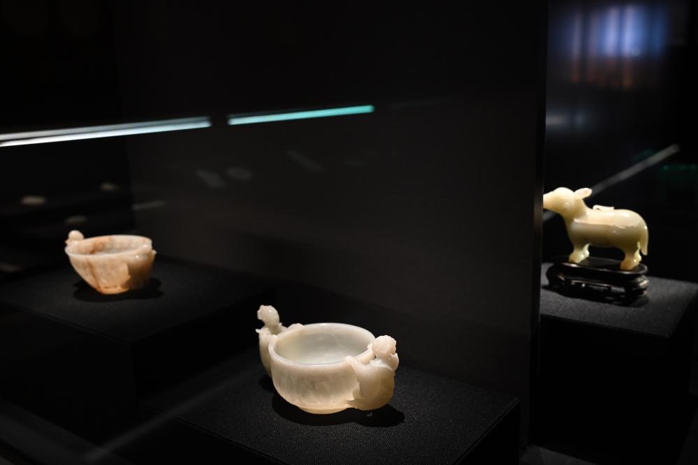 1月6日拍摄的乾隆款白玉礼乐图杯(中)。