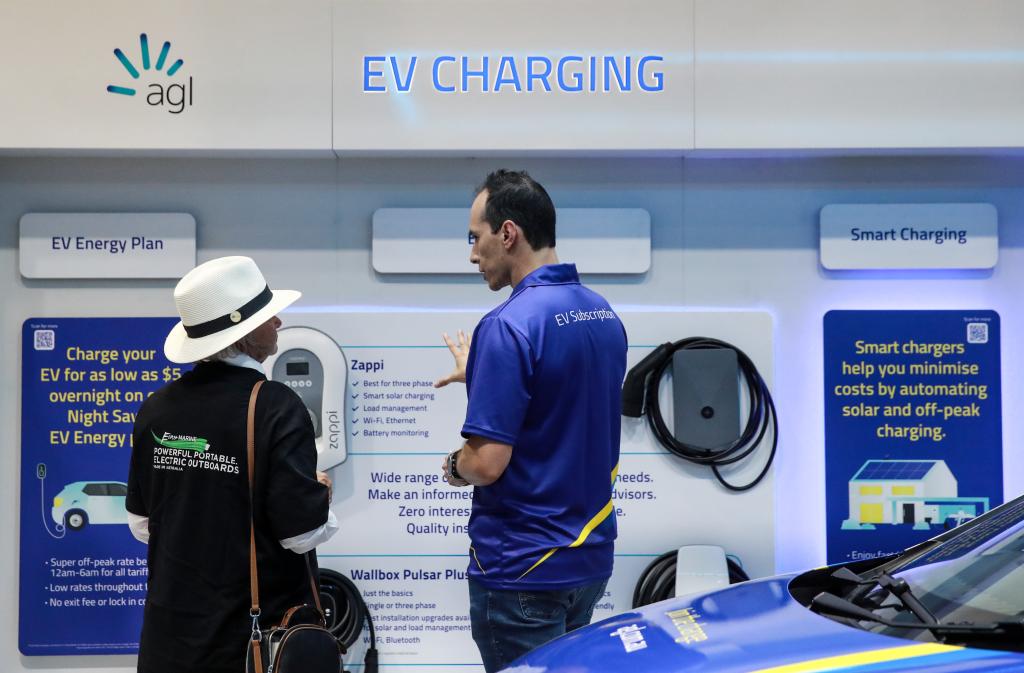 3月7日,在澳大利亚悉尼举行的家庭能源与电动车展上,工作人员为参观者介绍电动汽车充电设备。