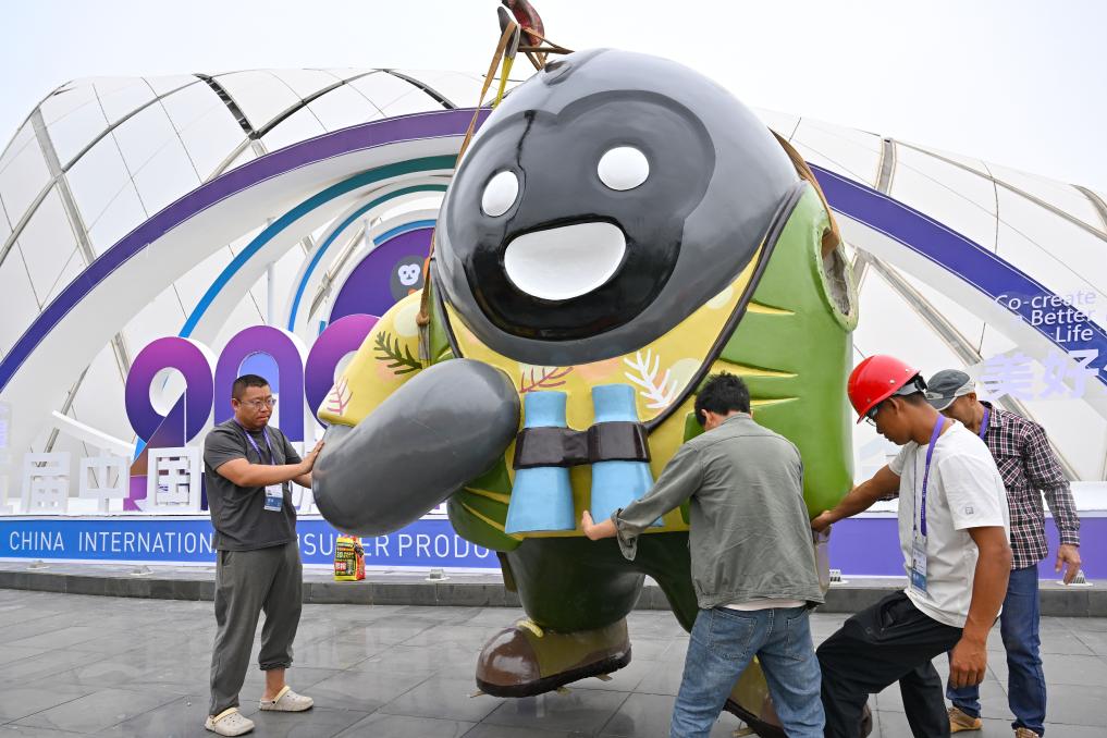 4月10日,工作人员在摆放消博会吉祥物。