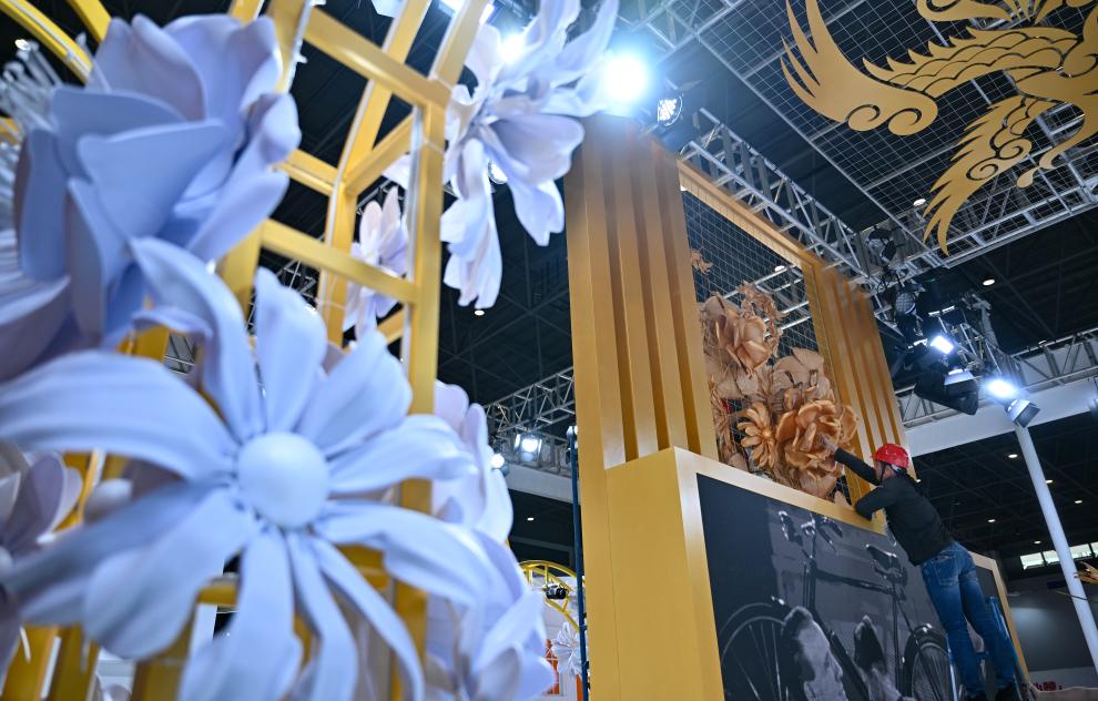 4月10日,展商在消博会主场馆布展。