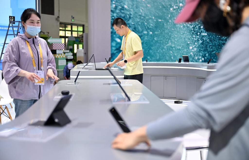 4月10日,工作人员在消博会主场馆工作。