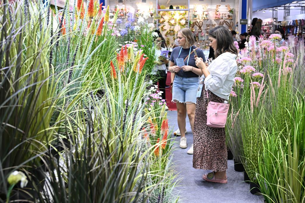 4月23日,在第137届广交会上,境外采购商观看仿真花草展区。