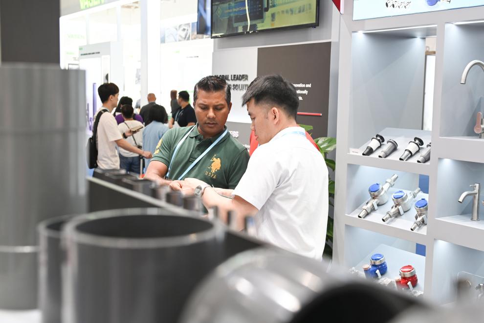 4月23日,客商在第137届广交会上选购卫浴产品。