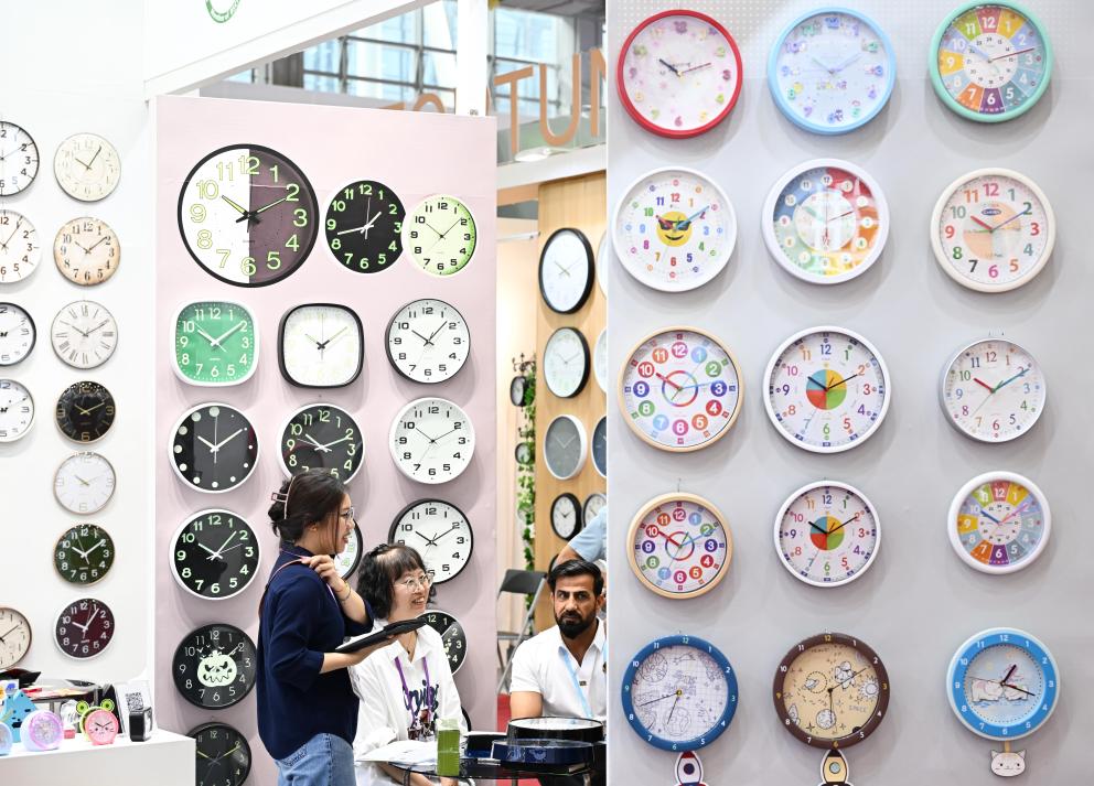 4月23日,在第137届广交会上,境外采购商在钟表展区洽谈。