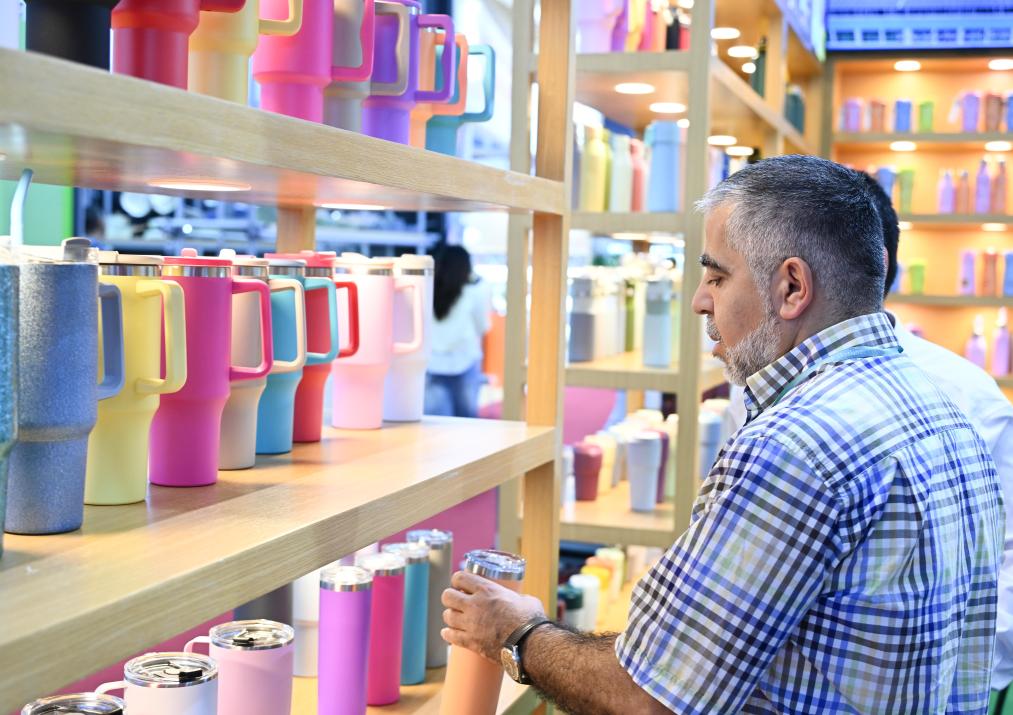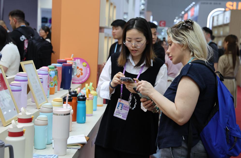 4月23日,在第137届广交会上,境外采购商观看水壶产品。