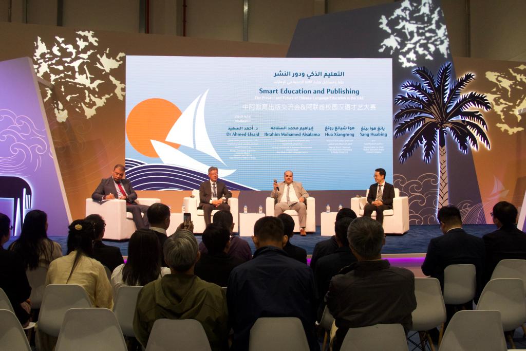 4月27日,与会者参加在阿联酋阿布扎比国家展览中心举办的中阿教育出版交流会。