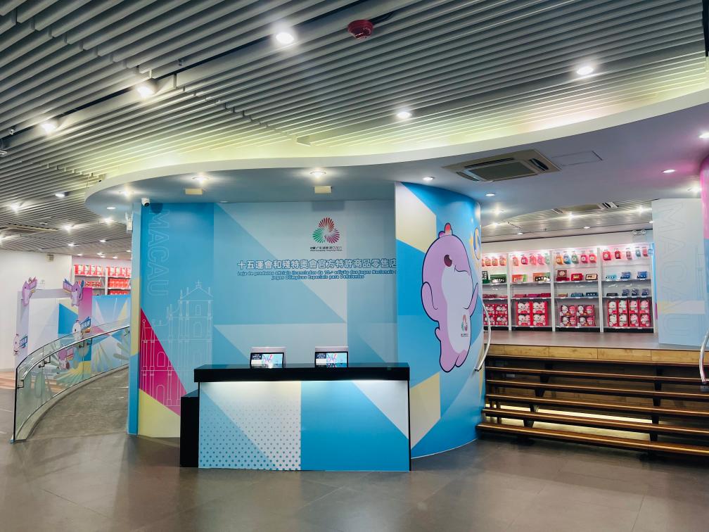 首间十五运会和残特奥会澳门赛区官方特许商品零售店设于塔石体育馆展览厅,是澳门赛区的官方旗舰店。店内展示及发售多款以吉祥物“喜洋洋”和“乐融融”为主题的官方特许商品,涵盖玩偶、纪念徽章、生活用品、工艺品等,现场还设有打卡拍照装置,打造沉浸式体验空间,让市民旅客共享十五运会和残特奥会的热闹气氛。