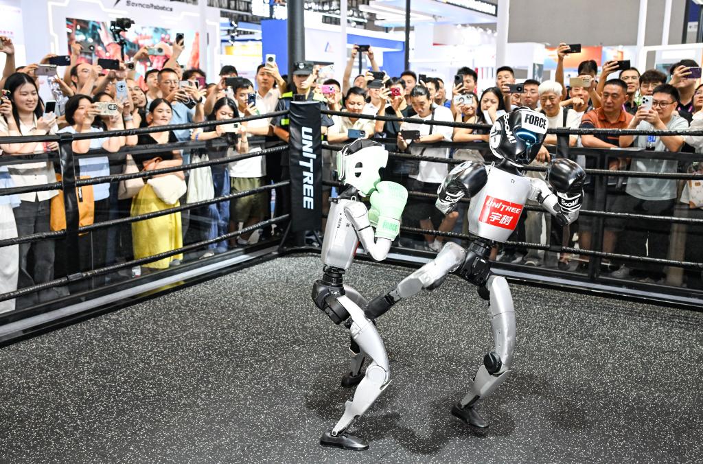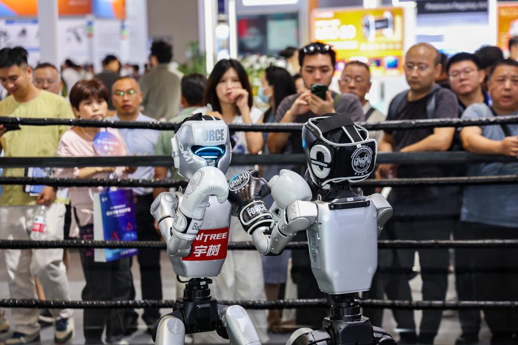 这是9月5日在2025世界智能产业博览会上拍摄的人形机器人拳击比赛。
