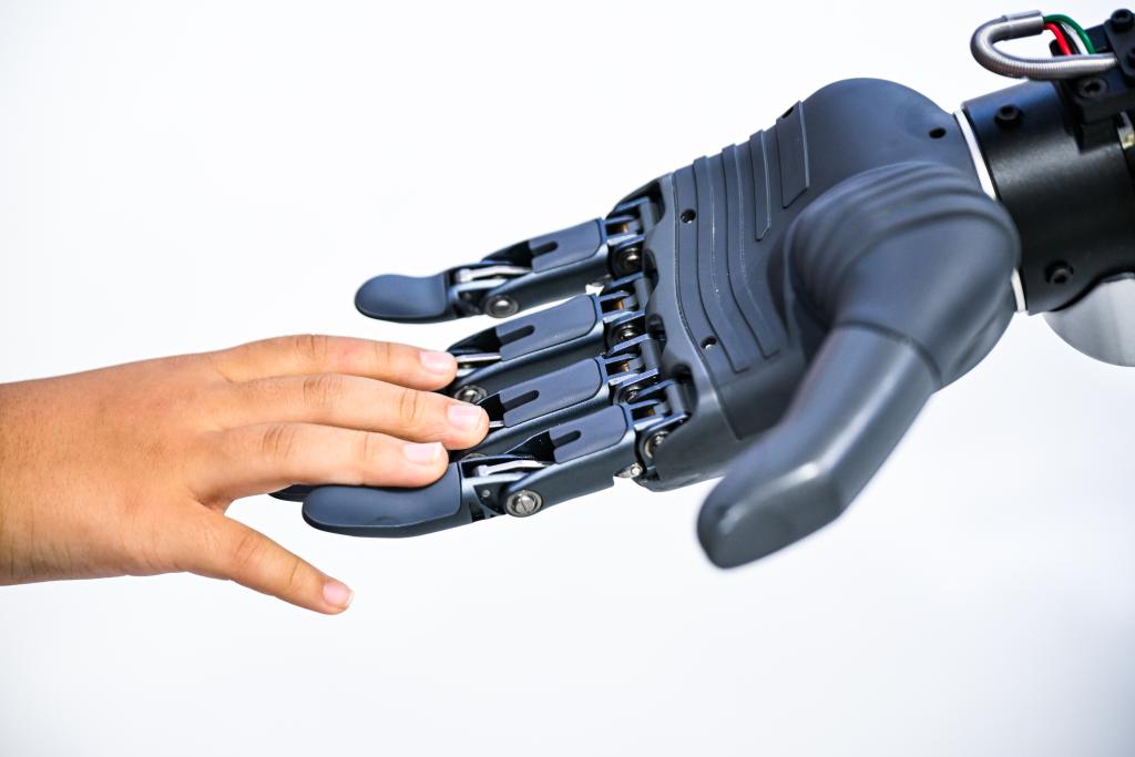 9月7日,小朋友在2025世界智能产业博览会上与人形机器人互动。