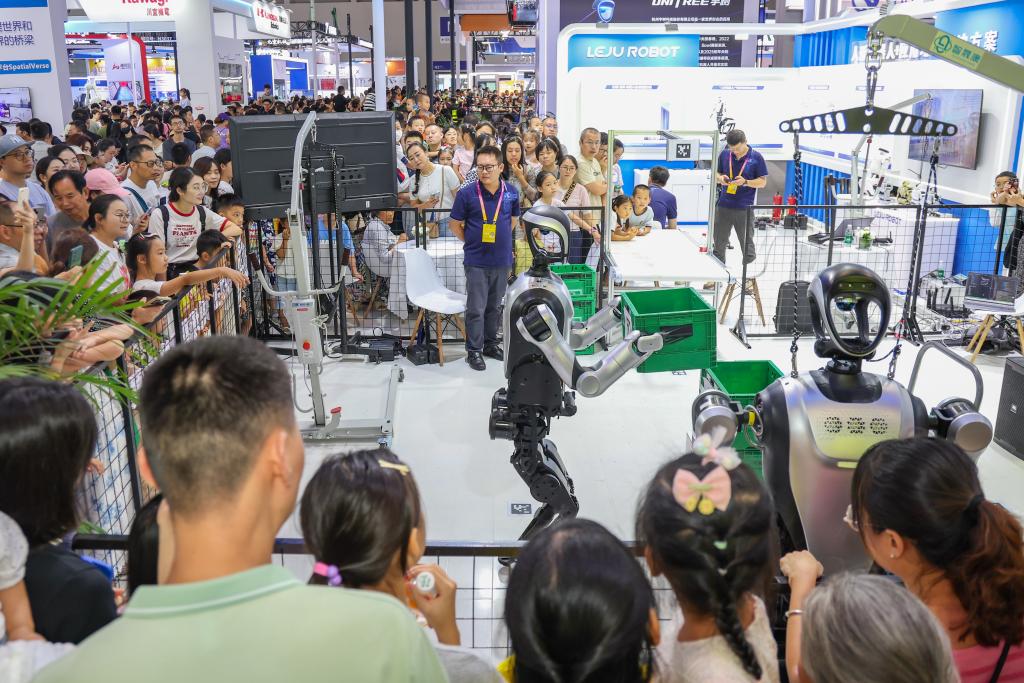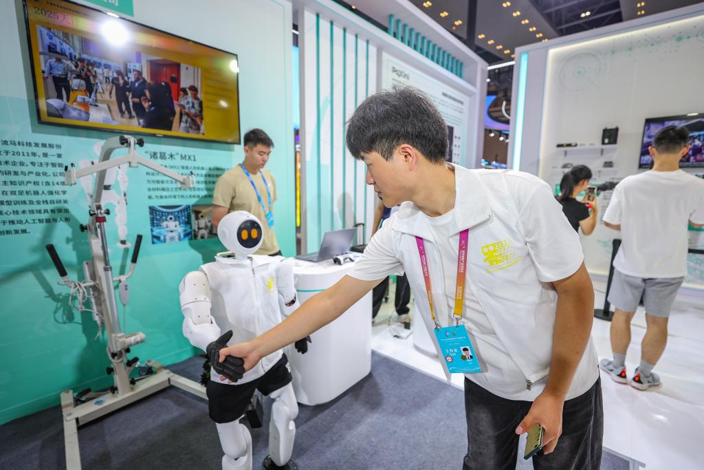 9月5日,在2025世界智能产业博览会现场,参展商和人形机器人互动。