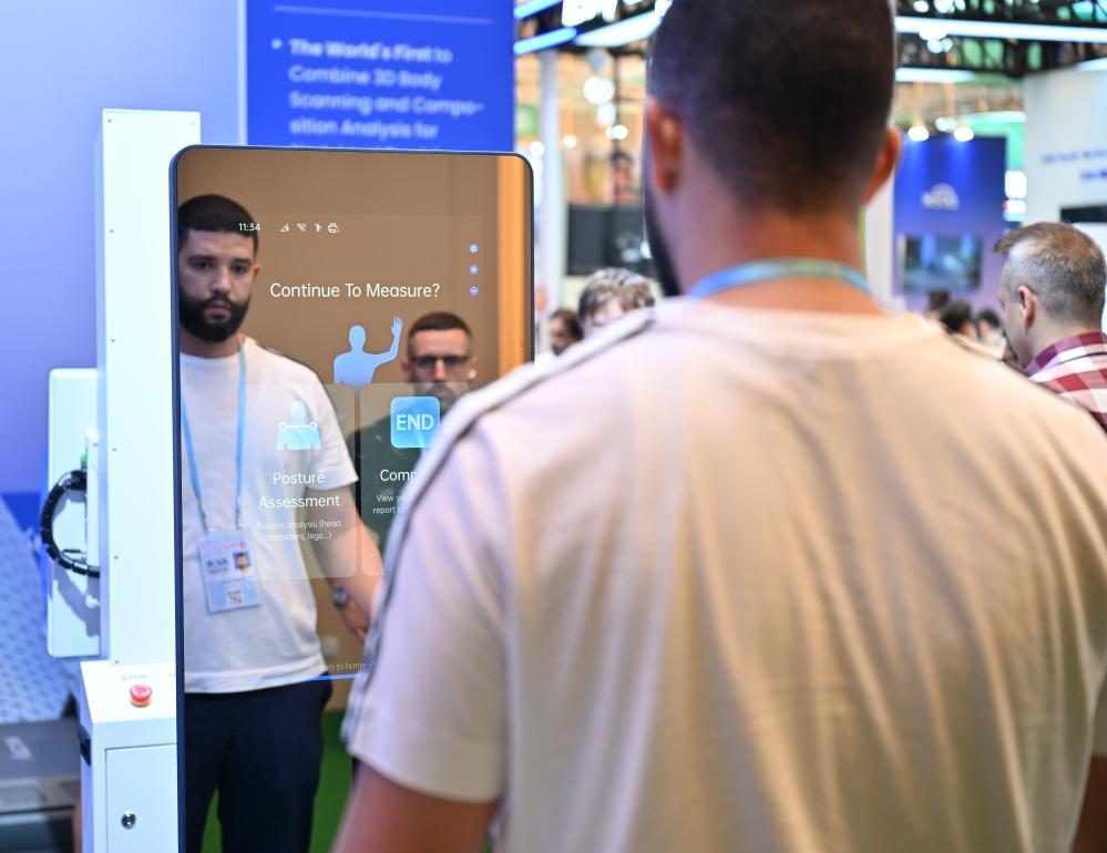 11月3日,客商在广交会展馆体验一款智能身体测量产品。