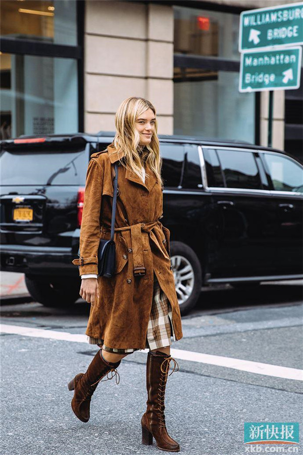 不同面料间的同色搭配更能突出层次感。比如外穿羽绒外套,那么内搭可以选择毛绒质地如针织衫、毛衣等看上去软糯的衣物,外穿毛呢大衣,那么内搭可以选择缎面、莫代尔等看上去轻薄的衣物。下装则可以运用高筒靴或者短靴与裙子、裤子的高低比例来进行层次感的调整。