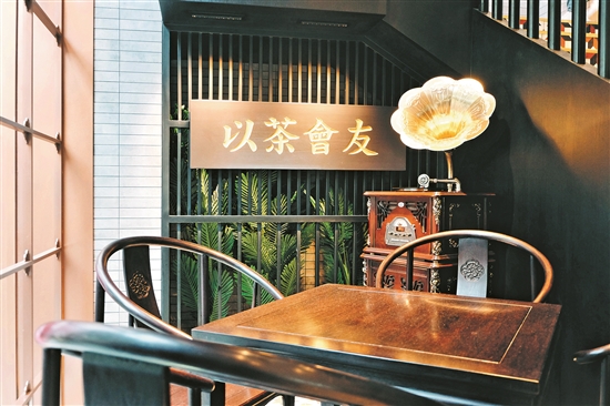 在店内,随处可见这一年轻的饮品品牌在融合传统中做出的改变。一楼吧台用原木搭建,木纹与石材构造出传统茶楼氛围,店内二楼的空间被间隔成西关大屋中常见的“客厅”和现代风格的休息区。“以茶会友”的牌匾、花阶砖、木扶手、八仙桌、留声机……展现了广府文化中西融合的特点。