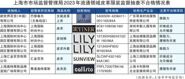 2月13日,上海市市场监管局发布皮革服装监督抽查情况。结果显示,有6批次产品不合格,涉及AMASS、callisto、LILY等品牌。