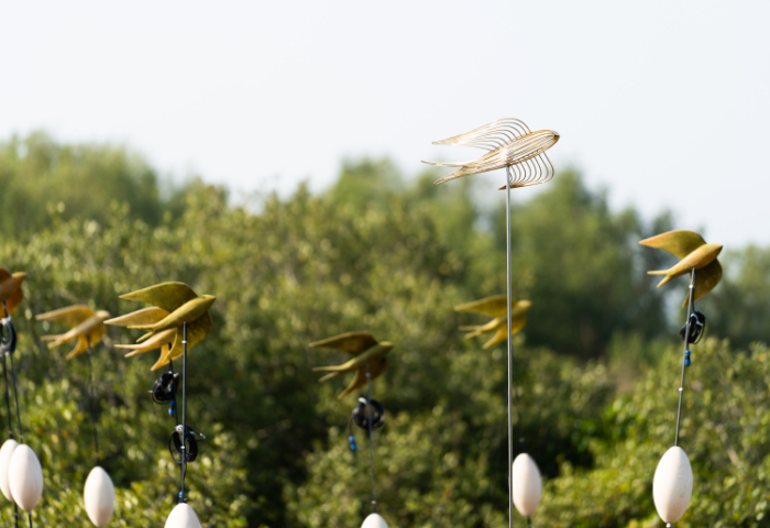 此次生态探索之旅中,马爹利与多学科视觉艺术家袁隆(Alex Long Yuan)共同打造的艺术装置正式亮相。一群金色雨燕摇曳徜徉于红树林中,寓意着马爹利作为环保使者,为红树林带来勃勃生机。装置的主体造型采用互花米草作为视觉材料,并配有太阳能供电与二氧化碳监测系统,雕塑灯光颜色能随日升月落、以及周围二氧化碳浓度产生变化,可视化呈现大自然的“呼吸”与红树林强大的固碳作用。以艺术赋能环保,马爹利希望借此进一步增强红树林保护的感召力,吸引更多人的关注与参与。