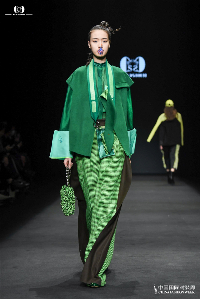 本场大秀展现了传统工艺与现代造型交织相融的浪漫主义风格,袁利以服装设计语言,将刚柔并济、简繁相生等冲突表现出来。整个系列以绿、紫、黑、红等高饱和度色彩作为主色,呈现出一种向上又明媚的昂扬力量,也蕴含着国人雅致的审美意趣。
