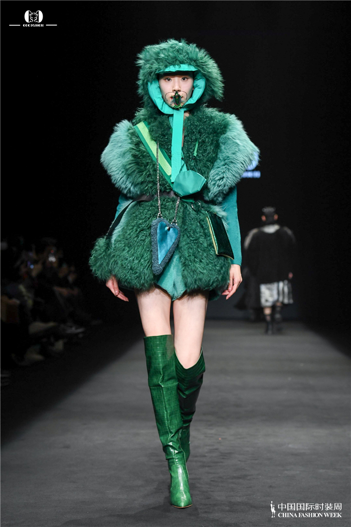 大秀开场,伴随着清脆的鸟叫虫鸣,身着COCOSIMON高级成衣的模特登场。剪裁利落的造型上,一只只立体的昆虫装饰在模特的展示下带给观众与众不同的视觉冲击。