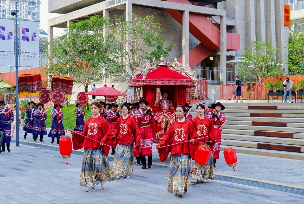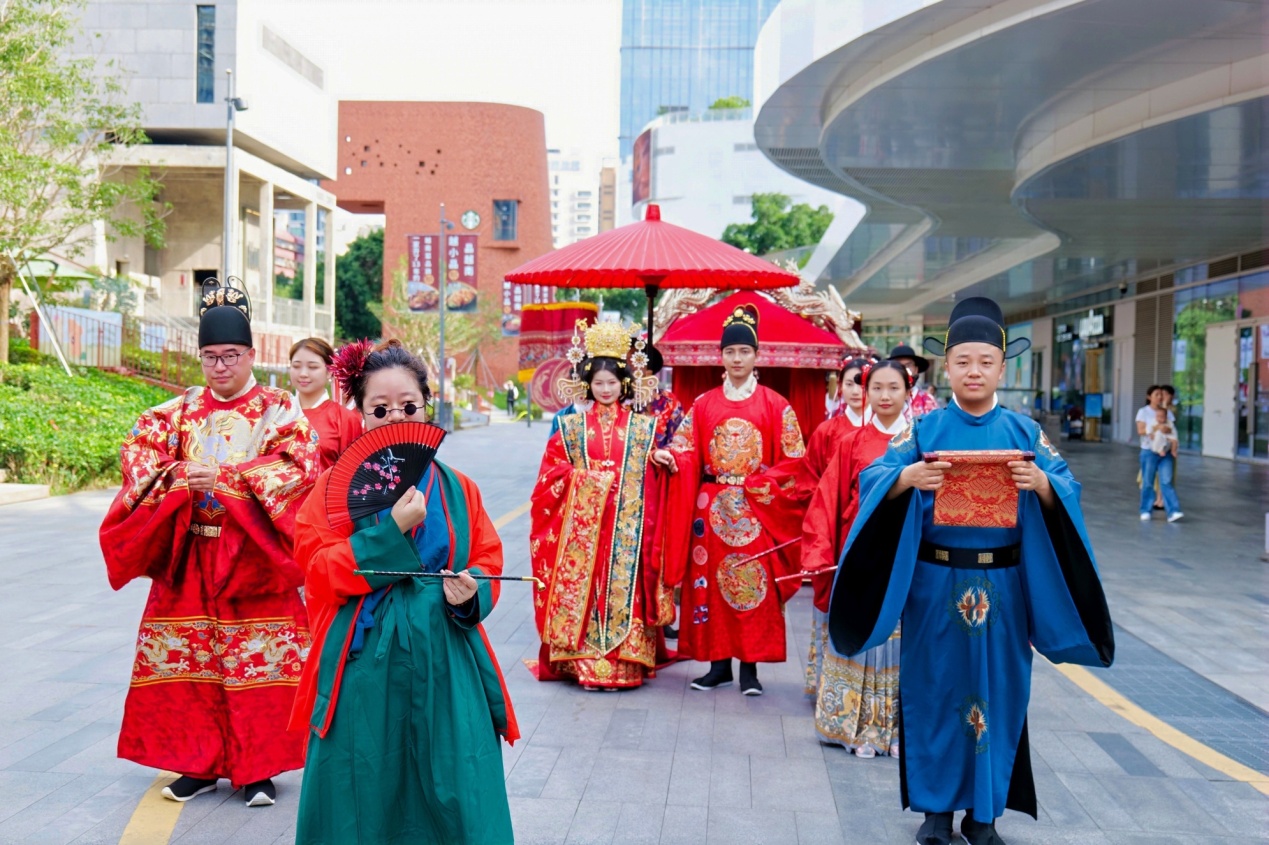 此次推广展是“圳有喜事·倾慕天河”系列活动中的重要主题环节之一。主会场设于粤海天河城,以“空中喜道”概念打造沉浸式浪漫场景,从空中迎亲、直升机婚礼、民族风巡游,到DIY婚戒工坊、“山海誓约”婚拍体验,让传统中式婚庆焕发现代魅力,全面展现“甜蜜经济”的创新模式。活动期间,500多对新人完成婚姻登记并参与“空中婚礼”体验,现场人气火爆,浪漫氛围席卷罗湖。