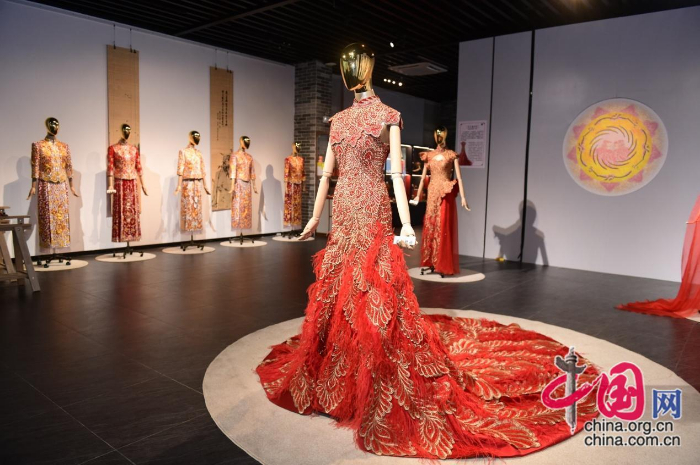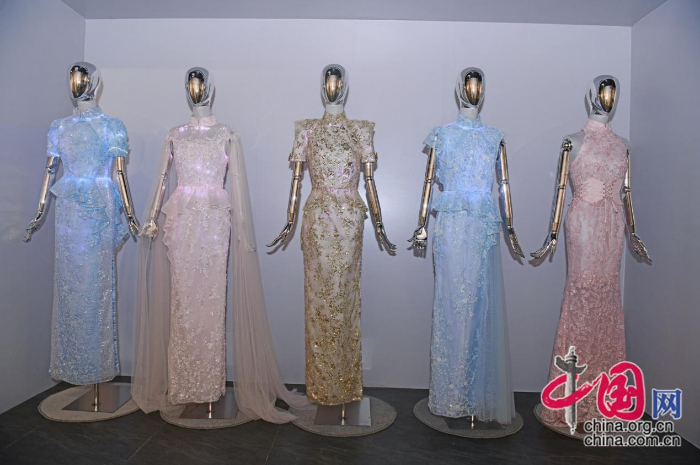 此次展览汇聚了赵亚坤在清代服饰非遗价值研究项目中的心血,展示了多个系列融合清代服饰元素的作品,包括《光之翼》珠绣礼服系列,《龙耀凤熠》改良版龙凤褂裙系列,《锦弦玉韵》宋锦系列,《光华清韵》发光旗袍系列,《璨影华裳》苏锦系列,《锦绣韵华》云锦系列,《绎百羽金》珠绣礼服系列等。