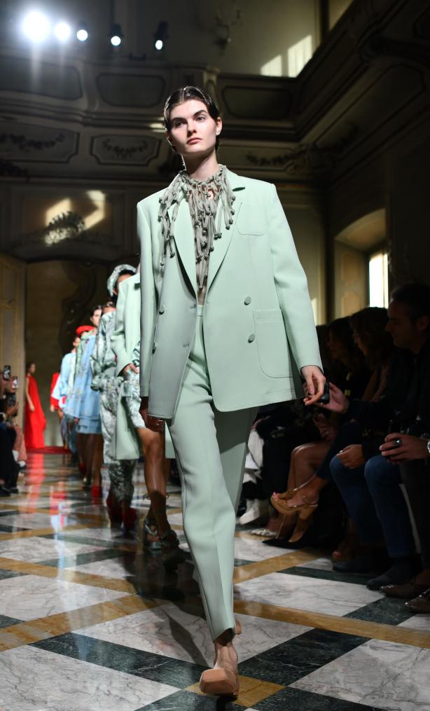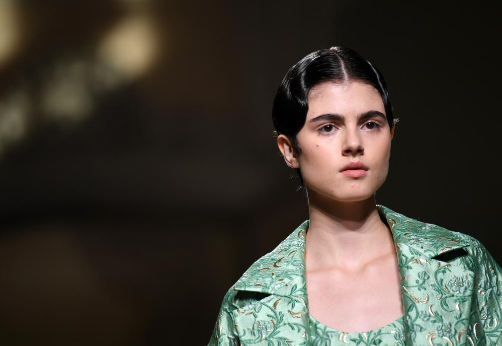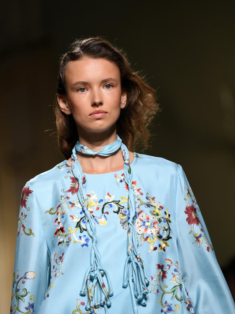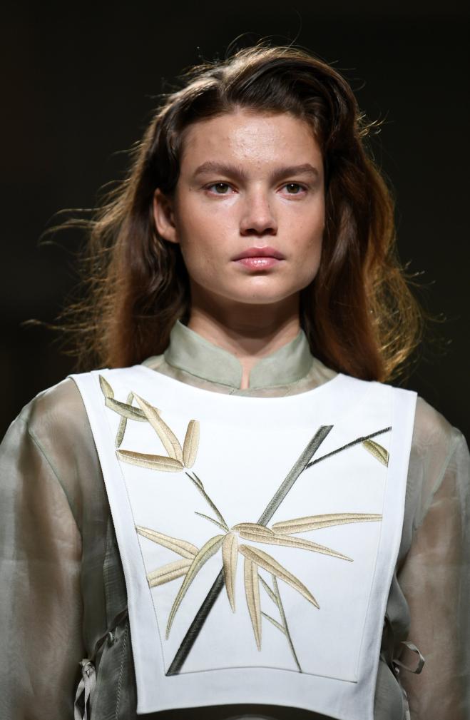 9月24日,模特在意大利米兰时装周上展示含有贵州苗绣元素的设计时装。