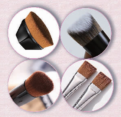 ▶ 粉底刷:常见的粉底刷有平口形、楔形、扁平形等,各有优劣。一般来讲,毛越密实、越柔软,越不容易留刷痕;刷口面积越大,上妆速度越快;刷面越扁,妆效越薄透水亮,但同时粉底的遮瑕效果也会打折扣;刷面如果有弧度或坡面,能更好照顾到鼻翼、眼角、眼尾等细节。