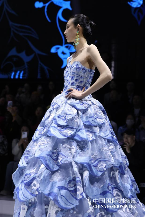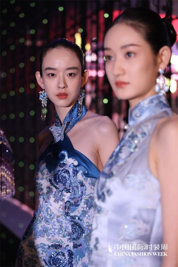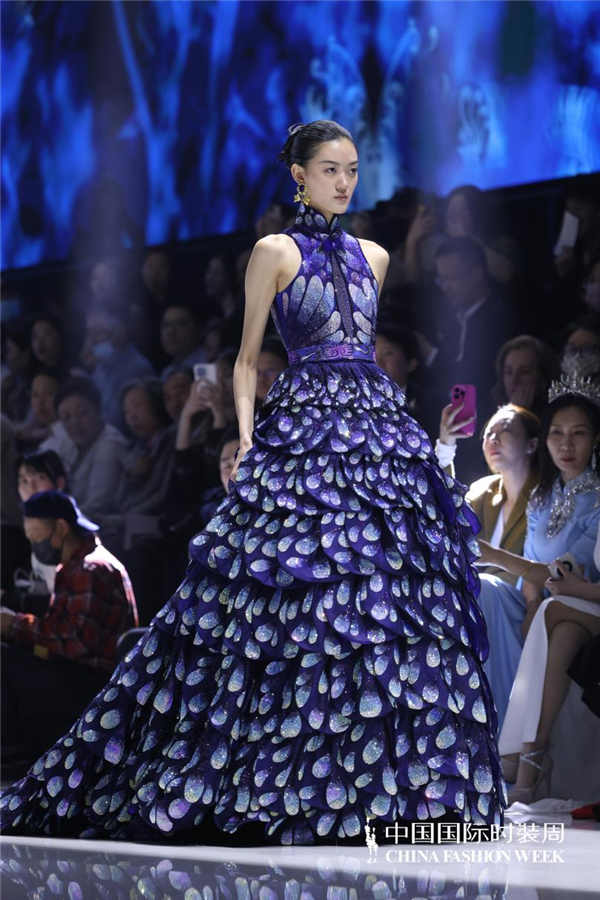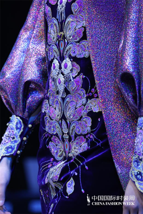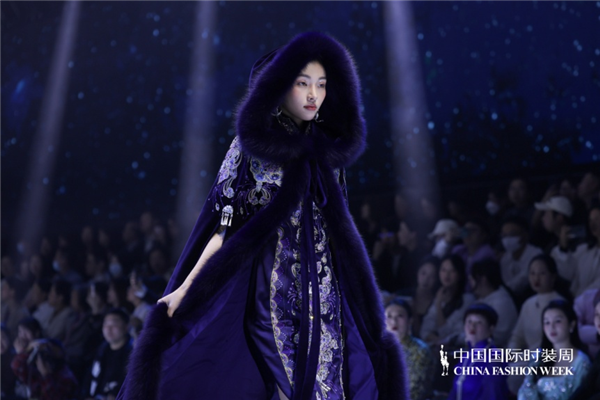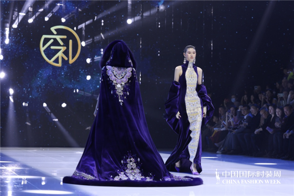 服装设计师提取苗绣文化的花纹与色彩元素,结合纹案温润流畅的廓形,通过主调蓝、青、红、紫等颜色,带来新一季的中式华服美学。