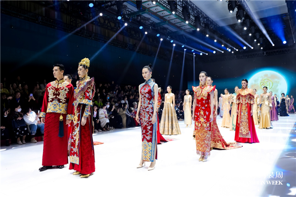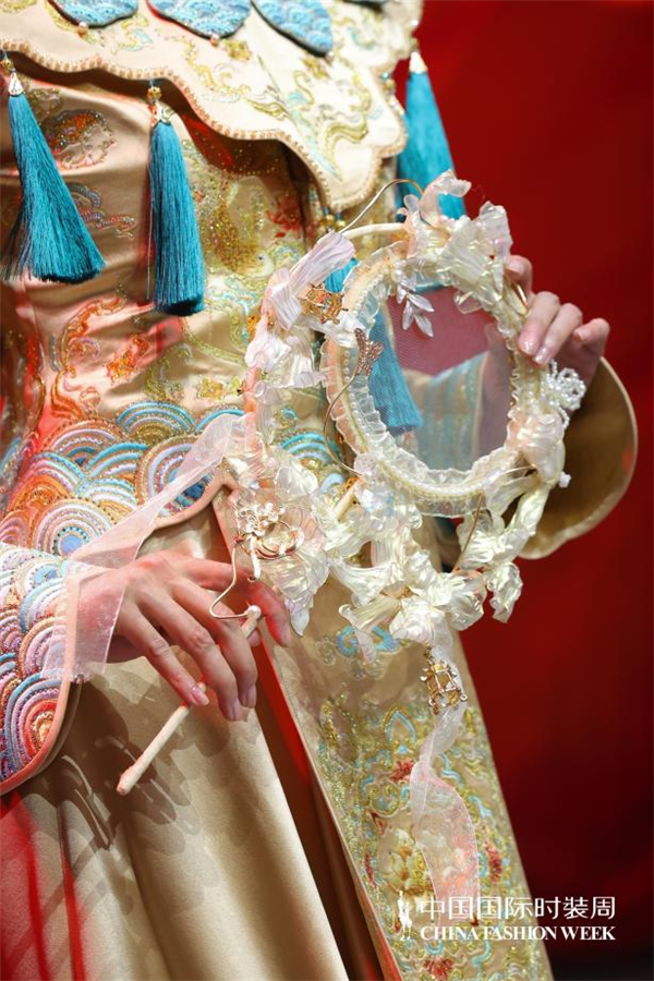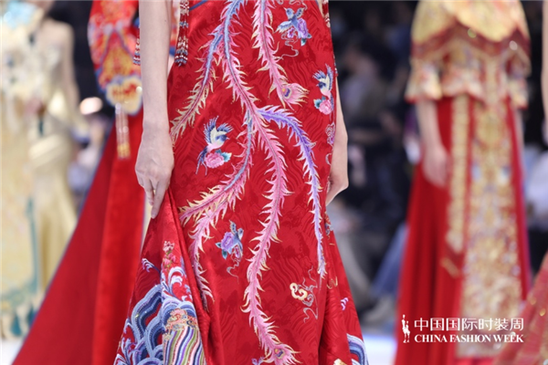 六礼LOOLAYY本次产品系列融入“苗银蜡染”“剪纸文化”以及“踏虎凿花”等非遗文化元素,丰沛品牌独有的设计语言,增添了一层悠久中华文化的底蕴。系列还特别引入了鸵鸟毛、贴补绣、复古蕾丝以及纯手工钉珠等工艺手法,与新型面料和天然面料相结合,呈现出多层次的视觉效果。充满象征意义的刺绣图案仿佛从悠久的历史中走来,为系列注入了浓郁的艺术气息。带领观众沉浸式领略中华国服之美,彰显“中国婚俗文化传承者与发扬者”的目标与人文匠心。