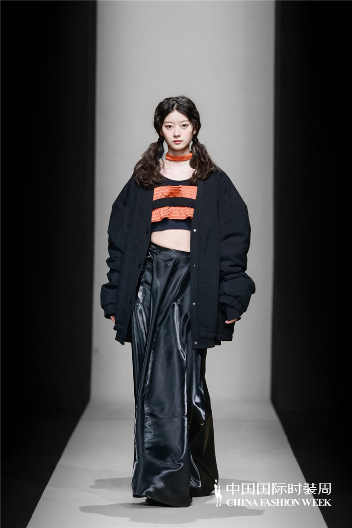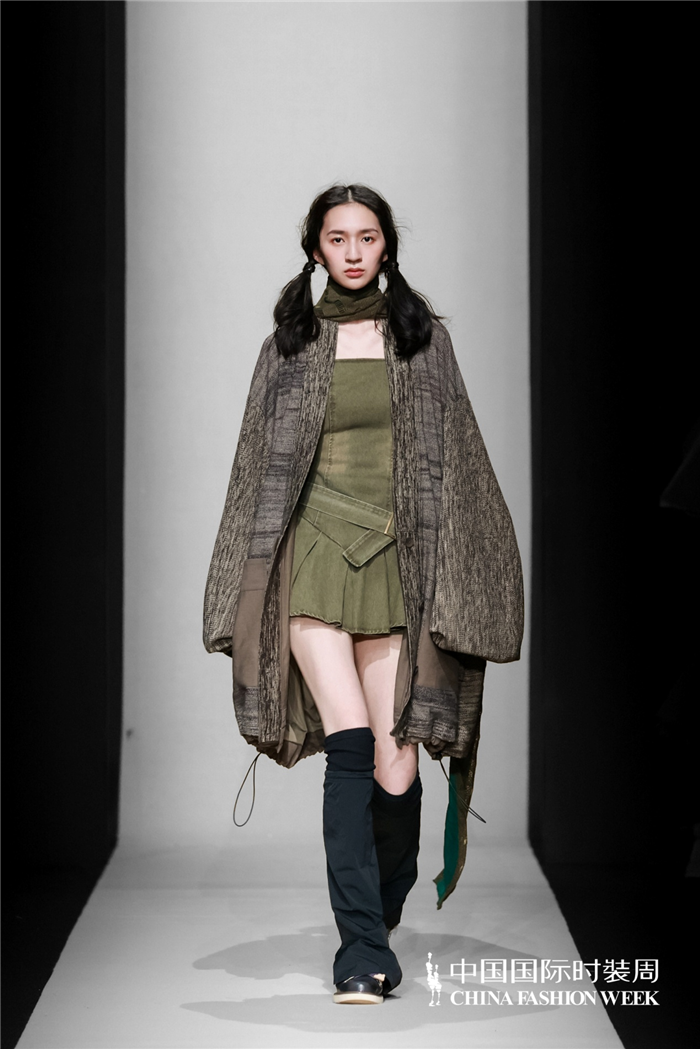 结构拼接上,成衣局部拼接棉混化纤针织和可拆卸功能则旨在强调关节在动态下的保护性、耐用性、跨温差以及特质性。结构拼接带来的颜色拼接,能够在宽廓型的放大下,突出色彩对比。宽松也不仅仅是服装结构的廓型,更是设计师专注穿着者回归生活本质的表达。