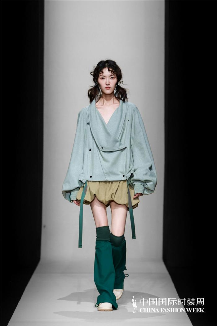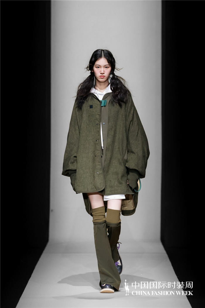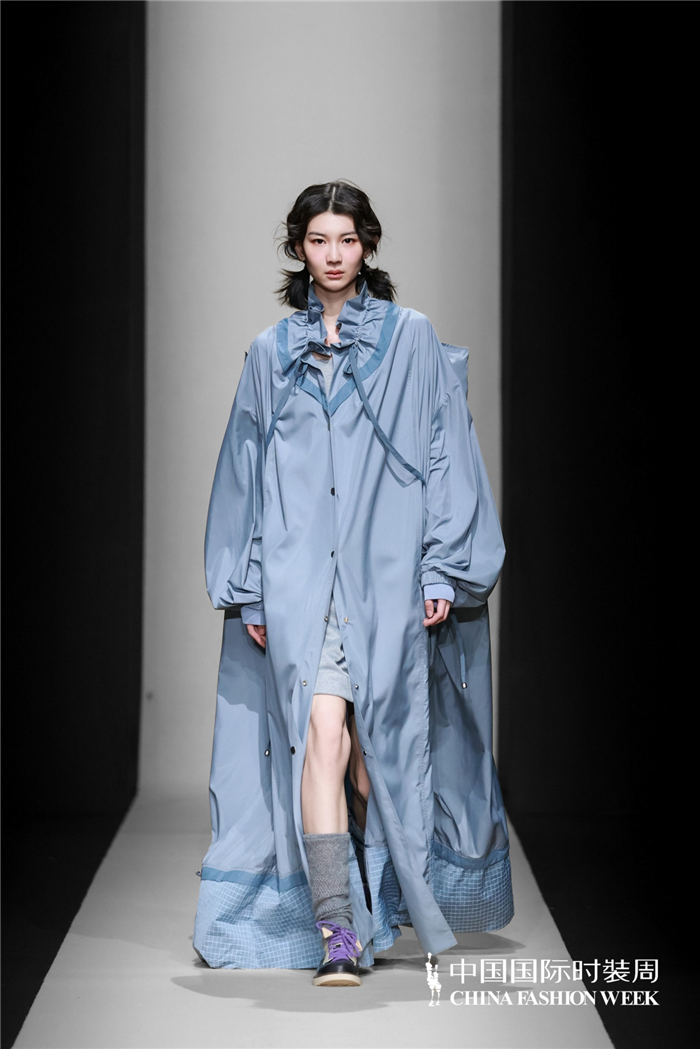 在材料选择上,以环境与自然可持续共存的低碳视角发掘人们生活中的实际需求,使用了科技型生态无氟防泼水特殊面料,独特水溶性纳米膜保持柔软、轻盈、防水功能性的同时,减轻对环境的消耗,使得每一件服饰都能适应不同的生活场景,实现轻量化、宽松的穿着体验,履行了设计师对人类和自然环境的使命,坚定了穿着者在成长中不断探索自我审视与自然的关系,通过日常的穿着选择,实践低碳生活。