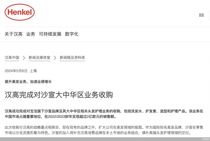 5月6日,汉高中国在官网宣布已经完成对沙宣大中华区业务的收购。“此次收购与汉高的战略重点相契合,即在现有的品牌之外,扩大公司在美发领域的版图。沙宣的加入将补充汉高消费品牌在本土市场的业务组合,填补高端头发护理领域的空白。”汉高中国方面表示。