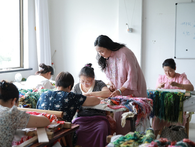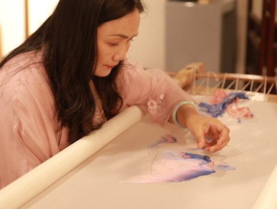 非遗苏绣传承人卢梅红在创作“青山”图案