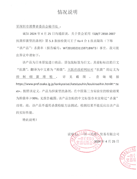 其样品瓶身有“抗菌”字样,故测试该样品杀菌率,检测结果显示:杀菌率为11%。王子ka品牌方提出:“该产品为日本原装进口商品,原包装标签为日文。其前标标注的日文‘抗菌’,翻译为中文意为‘抑菌’……该产品加贴的中文标签亦未宣称过‘杀菌’功效”。