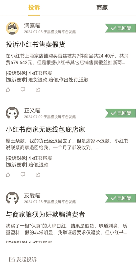调查还发现,网络上存在大量小红书商家涉嫌出售假货的投诉,仅以“黑猫投诉”平台为例,收录的相关投诉就超2500条。多位网友质疑“小红书包庇店家”,消费者维权困难重重。