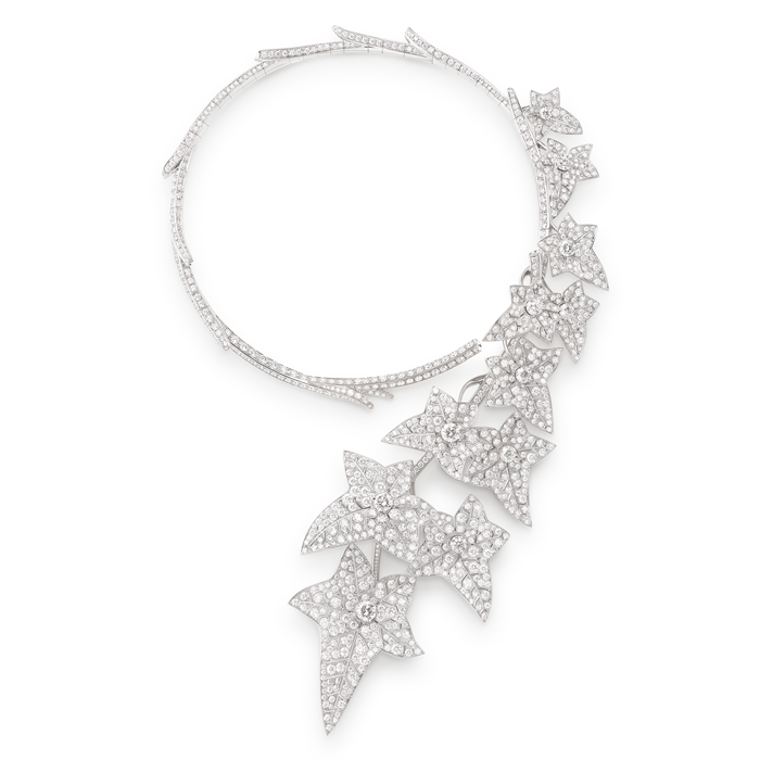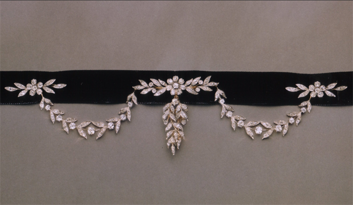 除了时装,织物与钻石的结合在宝诗龙的创作中也极为常见。世家创始人菲德烈克·宝诗龙(Frédéric Boucheron)出身于布匹世家,他的整个童年生活都与各种珍贵面料相伴,在创作中曾多次融入如蝴蝶结、丝带、黄金编织等高定时装元素。作为19世纪珠宝的典型代表,这条世家典藏项链由黑色丝绒缎带打造,精心镶嵌由叶片和花卉组成的钻石饰物。项链可通过丝带系在颈部,作为短颈链佩戴。在法兰西第二帝国时期(1852-1870),丝带和花卉的组合十分流行。花卉和叶片的图案源自法国18世纪的艺术风格。法国皇后尤金妮(Eugénie)对此格外热衷,使得整个贵族社会纷纷仿效。这些作品也以其柔软和优雅而备受赞赏。