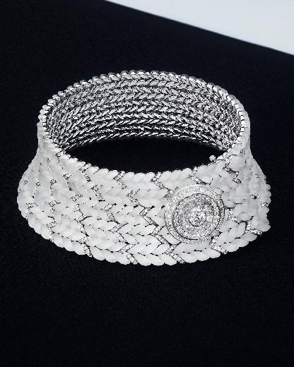 Tricot项链来自宝诗龙Histoire de Style, The Power of Couture高级珠宝系列,创意总监Claire Choisne重温世家与高定时装的深厚渊源,以全新视角审度盛典礼服的内涵。这条项链如同一件水晶编织的艺术杰作,是对针织品中人字纹理的焕新演绎。其中,每种材质皆使用喷砂工艺,并经由镍钛合金线巧妙连接,精心呈现出一条五圈式项链。整条项链由钻石交错相连,仿佛由水晶编织而成,其间采用一枚铺镶长阶梯形钻石、圆形钻石及水晶的钮扣作为点缀,流淌闪耀晶璨。项链的主石为一颗2.01克拉圆钻(D VVS2)。
