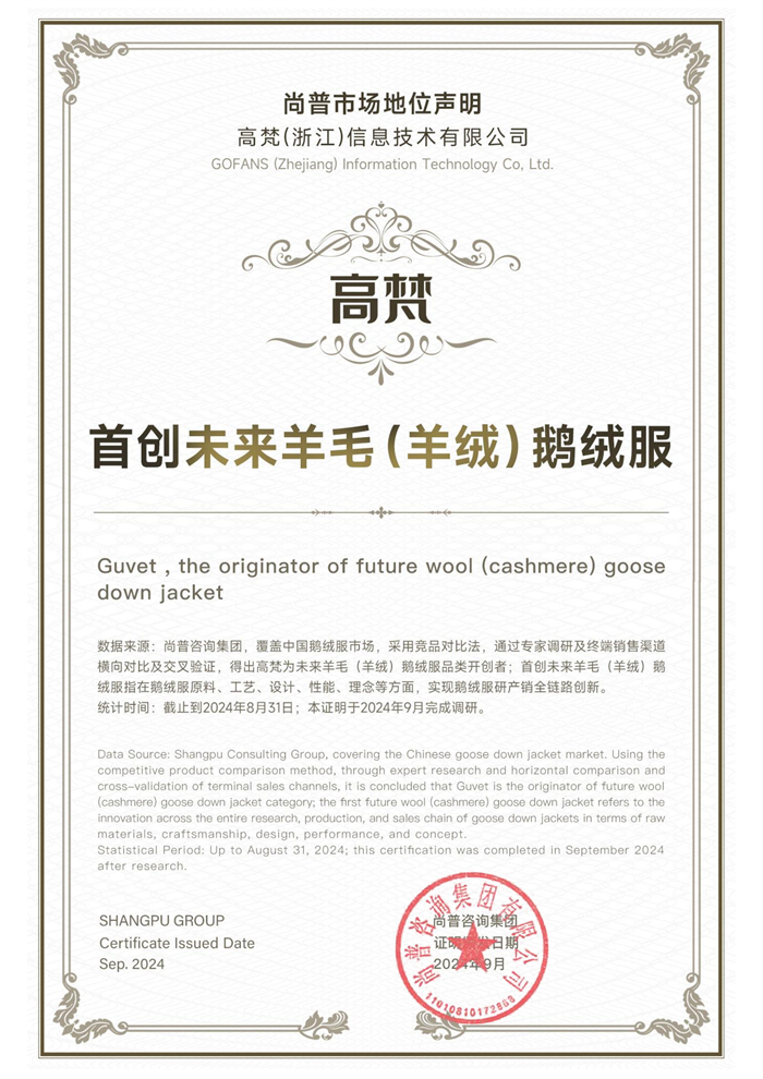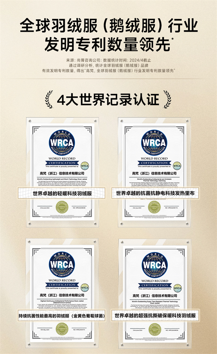 高梵全球羽绒服行业发明专利数领先;高梵获WRCA认证