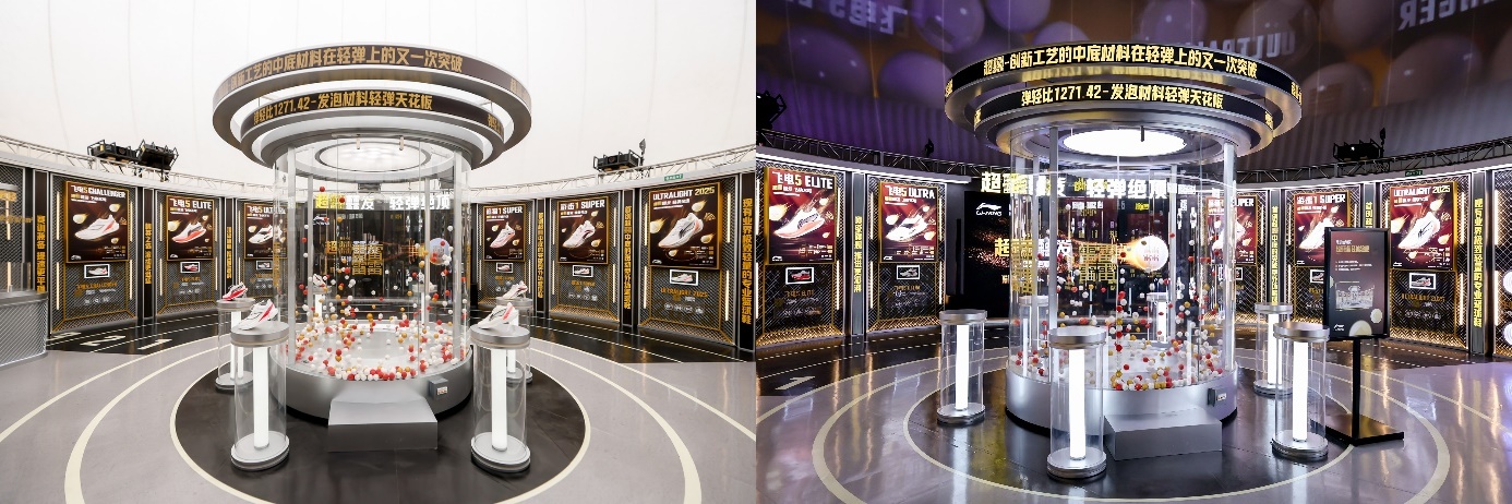 本次超䨻快闪活动集创意视觉呈现、科技分享会及沉浸式互动体验于一体,让超䨻科技的非凡性能与体验通过多元的感知形式生动传递。快闪空间以巨型“超䨻球”为创意原点,打造出极具冲击力的视觉观感,呈现李宁品牌独有的科技元素与创意理念,并全面展示自2019年推出䨻科技以来,6年4次应用突破的历程,进阶为由䨻、超䨻、䨻丝及极限䨻丝组成的䨻科技平台。