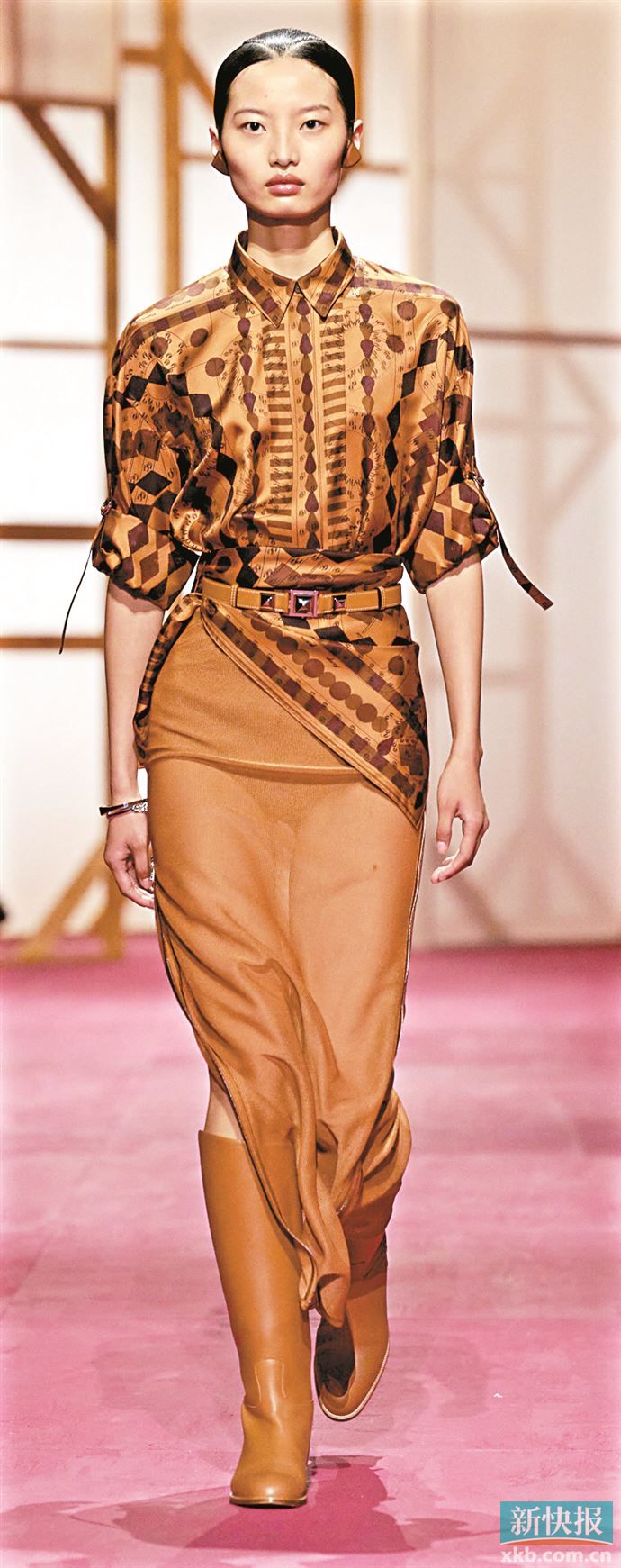 利用印花丝巾在腰间打造层叠效果,既能提高腰线又能营造分层效果。