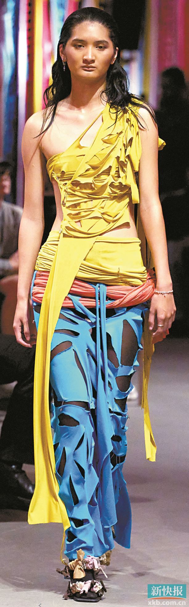 撞色的层叠造型穿搭需要注意每种色彩的比例以及恰到好处的露肤。